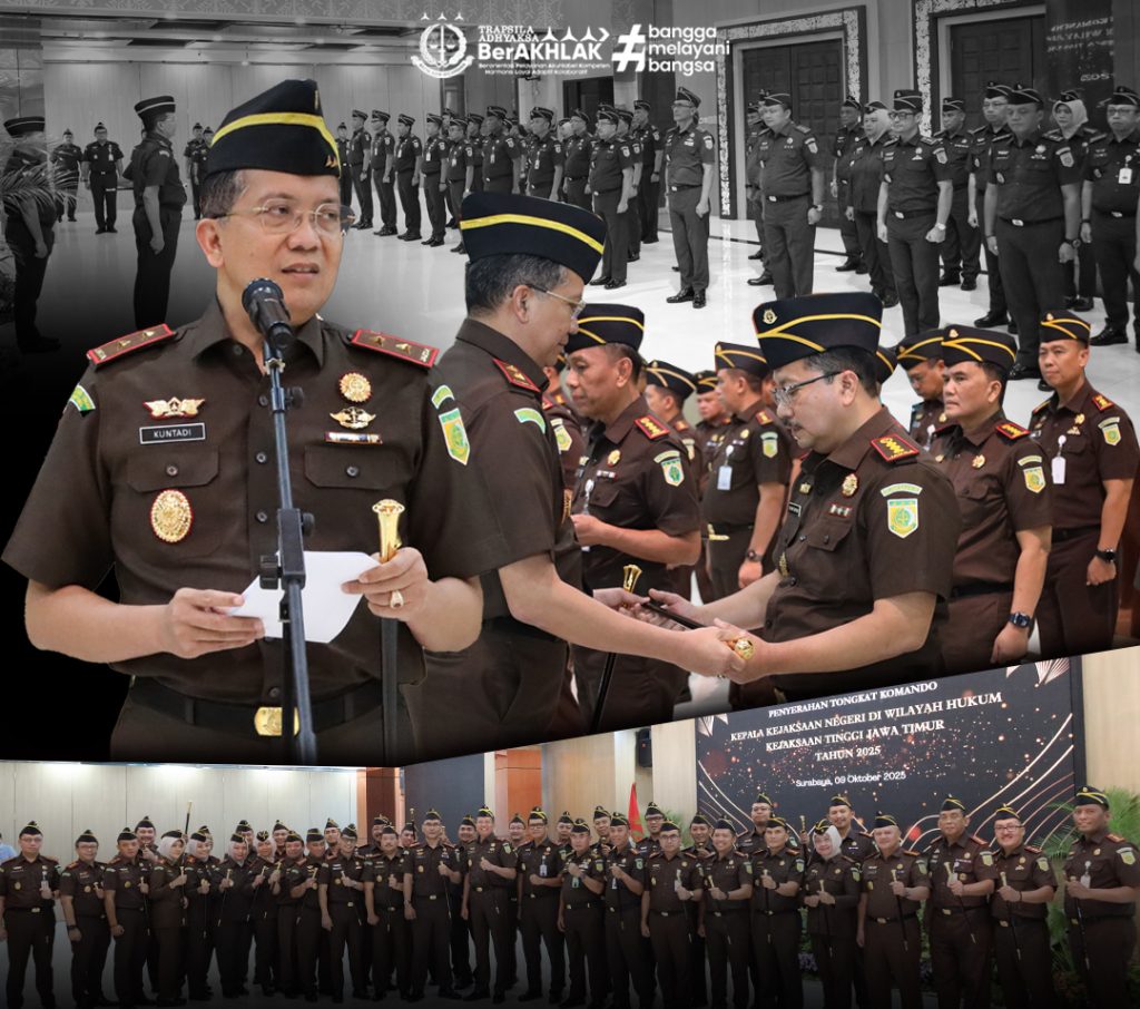 Surabaya – Kepala Kejaksaan Tinggi Jawa Timur, Dr. Kuntadi S.H., M.H., memimpin pelaksanaan Upacara Penyerahan Tongkat Komando kepada Kepala Kejaksaan Negeri di wilayah hukum Kejaksaan Tinggi Jawa Timur yang digelar di Aula Sasana Adhyaksa, Kamis (9/10/2025).