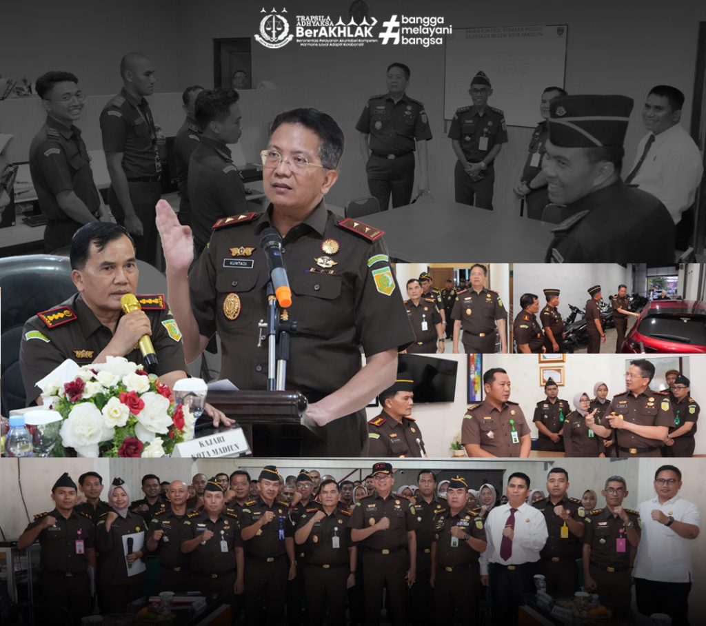 Kota Madiun – Kepala Kejaksaan Tinggi Jawa Timur, Dr. Kuntadi, S.H., M.H., melaksanakan kunjungan kerja ke Kejaksaan Negeri Kota Madiun pada hari Rabu, 15 Oktober 2025. Kedatangan Kajati disambut langsung oleh Kepala Kejaksaan Negeri Kota Madiun Dede Sutisna, S.H., M.H. beserta para Kasi dan seluruh jajaran pegawai.