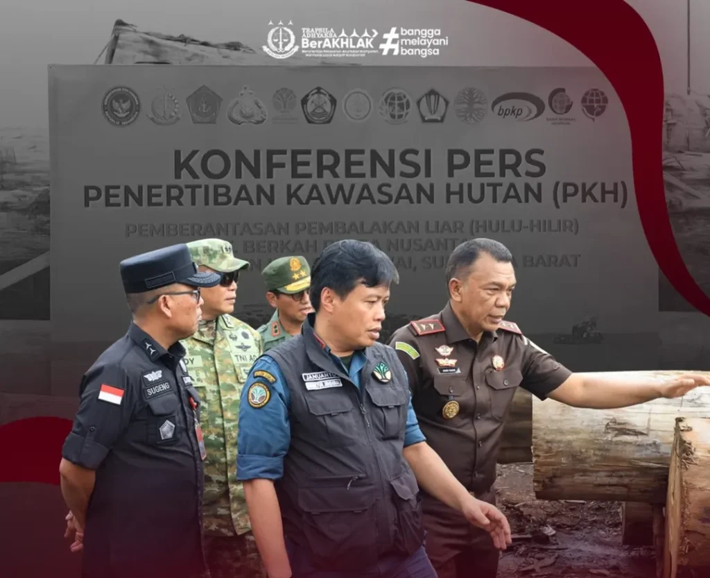 Gresik – Jajaran pejabat tinggi dari Kementerian Lingkungan Hidup dan Kehutanan (KLHK), Kejaksaan RI, TNI, dan Kepolisian yang tergabung dalam Satuan Tugas Penertiban Kawasan Hutan (Satgas PKH) menggelar konferensi pers di Pelabuhan Gresik, Jawa Timur , Senin (1/12/2025).