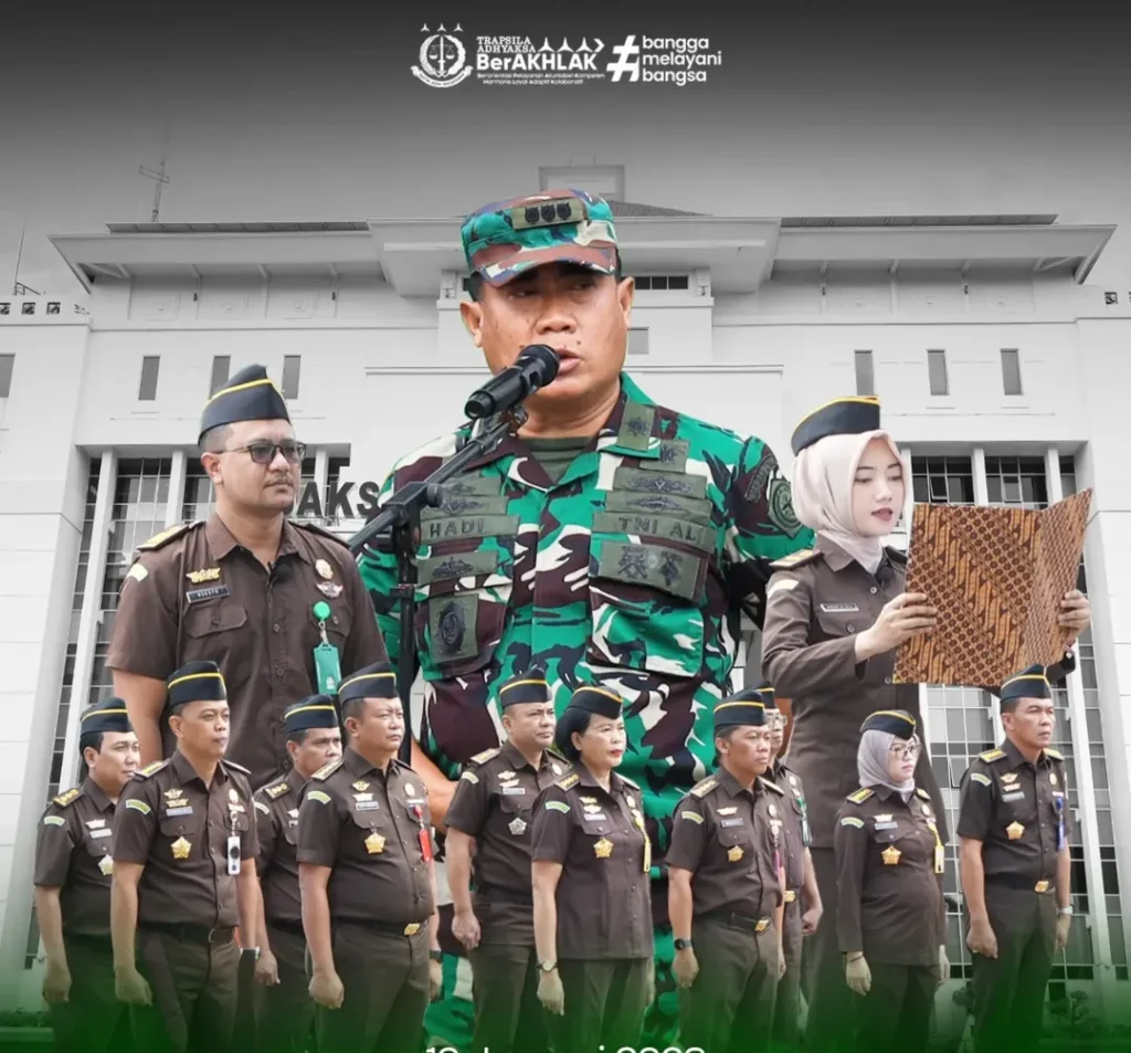 Surabaya — Asisten Pidana Militer (Aspidmil) Kejaksaan Tinggi Jawa Timur, Kolonel Laut (H) Hadi Pangestu, S.H., M.M., M.H., memimpin apel gabungan yang diikuti para Asisten, Kabag TU, Koordinator, para pegawai, serta personel TNI yang berlangsung di halaman Kantor Kejati Jatim, Senin (19/01/2026).
