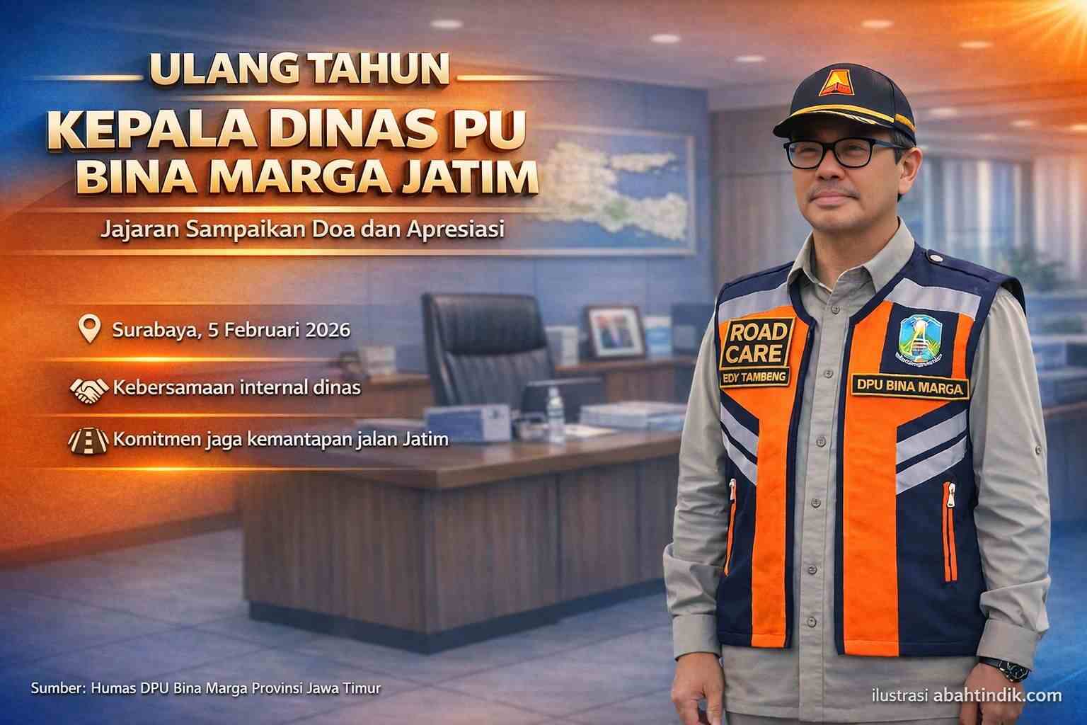 SURABAYA | abahtindik.com — Suasana kerja di lingkungan Dinas PU Bina Marga Provinsi Jawa Timur, Rabu (5/2/2026), terasa sedikit berbeda. Hari itu, Kepala Dinas PU Bina Marga Jatim, Edy Tambeng Widjaja, memperingati hari ulang tahunnya.