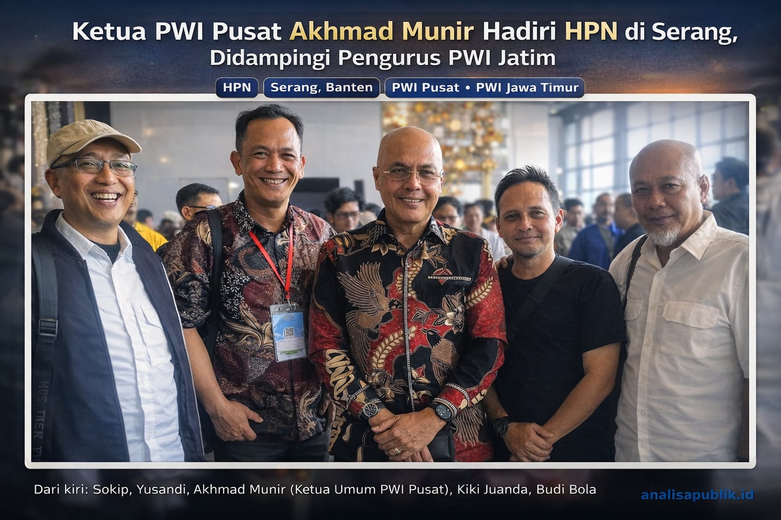 SERANG | analisapublik.id — Ketua Persatuan Wartawan Indonesia (PWI) Pusat, Akhmad Munir, menghadiri puncak peringatan Hari Pers Nasional (HPN) 2026 di Kota Serang, Banten, Sabtu (7/2/2026). Dalam agenda nasional tersebut, Munir didampingi sejumlah pengurus PWI Jawa Timur.