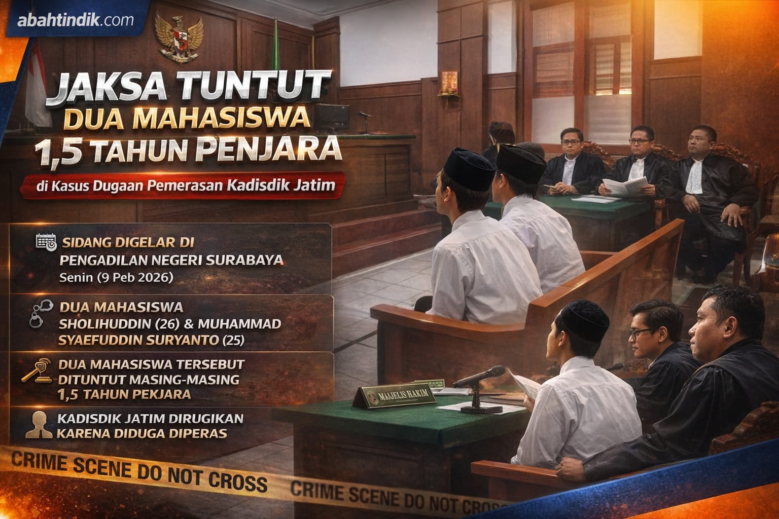 SURABAYA | abahtindik.com — Sidang perkara dugaan pemerasan yang menyeret dua mahasiswa kembali digelar di Pengadilan Negeri Surabaya, Senin (9/2/2026). Dalam agenda pembacaan tuntutan, Jaksa Penuntut Umum (JPU) dari Kejaksaan Tinggi Jawa Timur menuntut keduanya dengan hukuman penjara masing-masing satu tahun enam bulan.