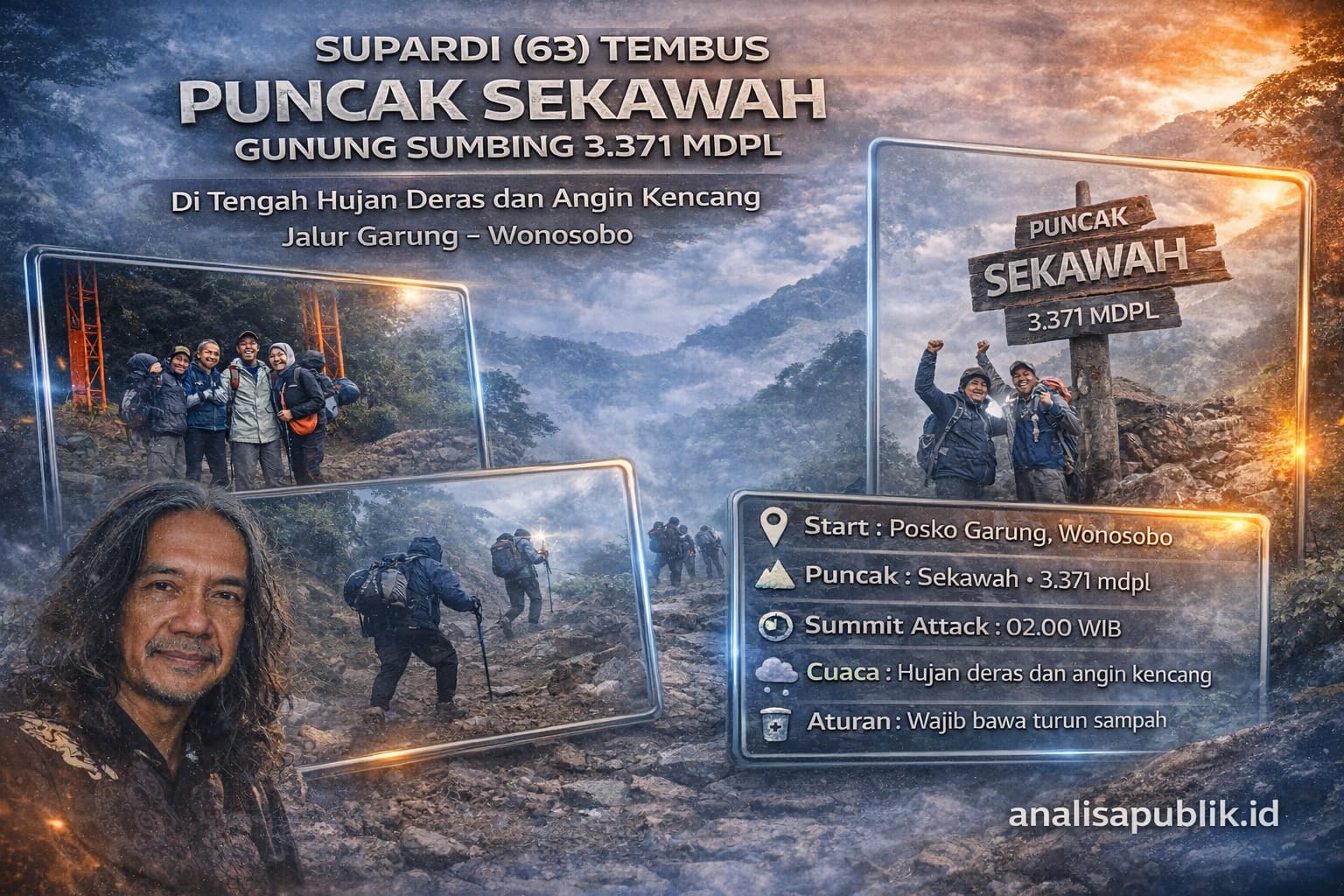 Supardi (63) bersama keluarga saat melakukan pendakian menuju Puncak Sekawah, Gunung Sumbing (3.371 mdpl) melalui jalur Garung, Wonosobo, dalam kondisi hujan, kabut tebal, dan angin kencang.