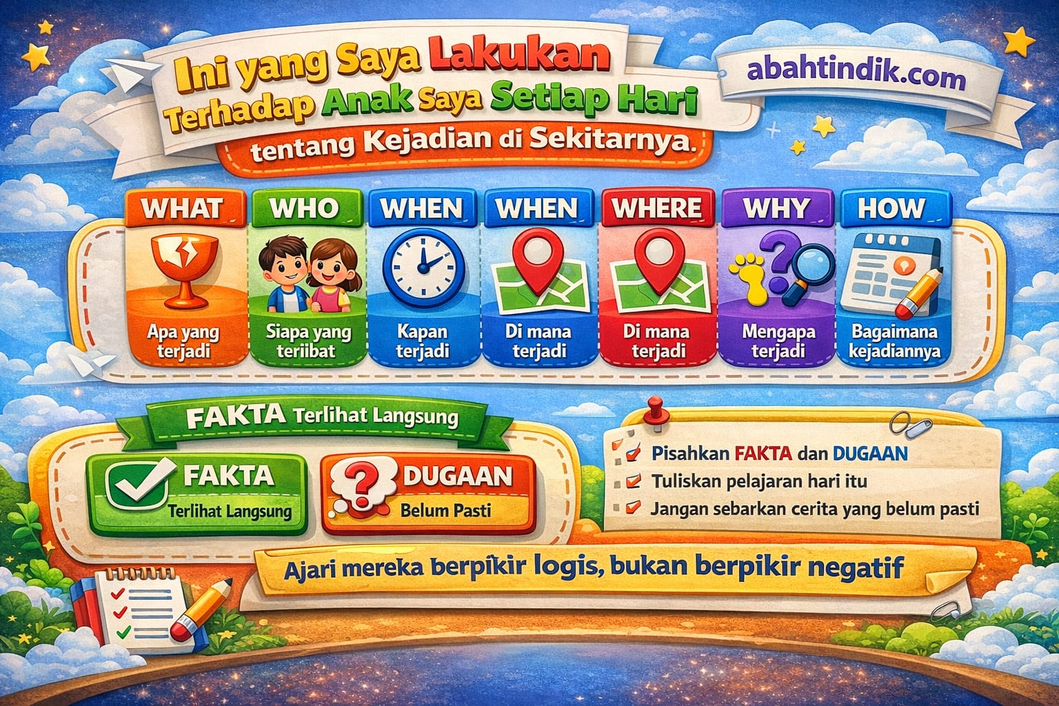 Ilustrasi format Laporan Harian Anak yang diterapkan H. Muhajir Wahyu Ramadhan untuk melatih anak berpikir logis melalui metode 5W 1H. Setiap kejadian dicatat berdasarkan fakta dan dugaan, lalu ditutup dengan pelajaran harian. Dok. Abahtindik.com