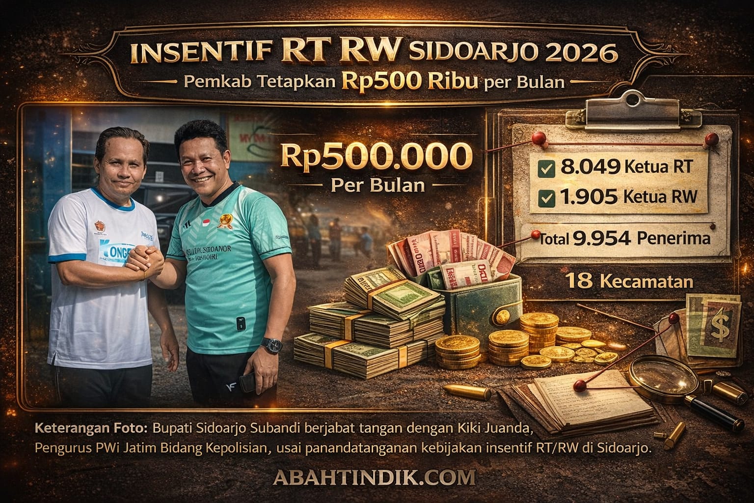 SIDOARJO – ABAHTINDIK.COM | Pemerintah Kabupaten Sidoarjo resmi menetapkan insentif Rp500 ribu per bulan bagi Ketua RT dan Ketua RW se-Kabupaten Sidoarjo. Kebijakan itu diteken langsung oleh Bupati Sidoarjo Subandi di Pendopo Delta Wibawa, Jumat 13 Februari 2026.