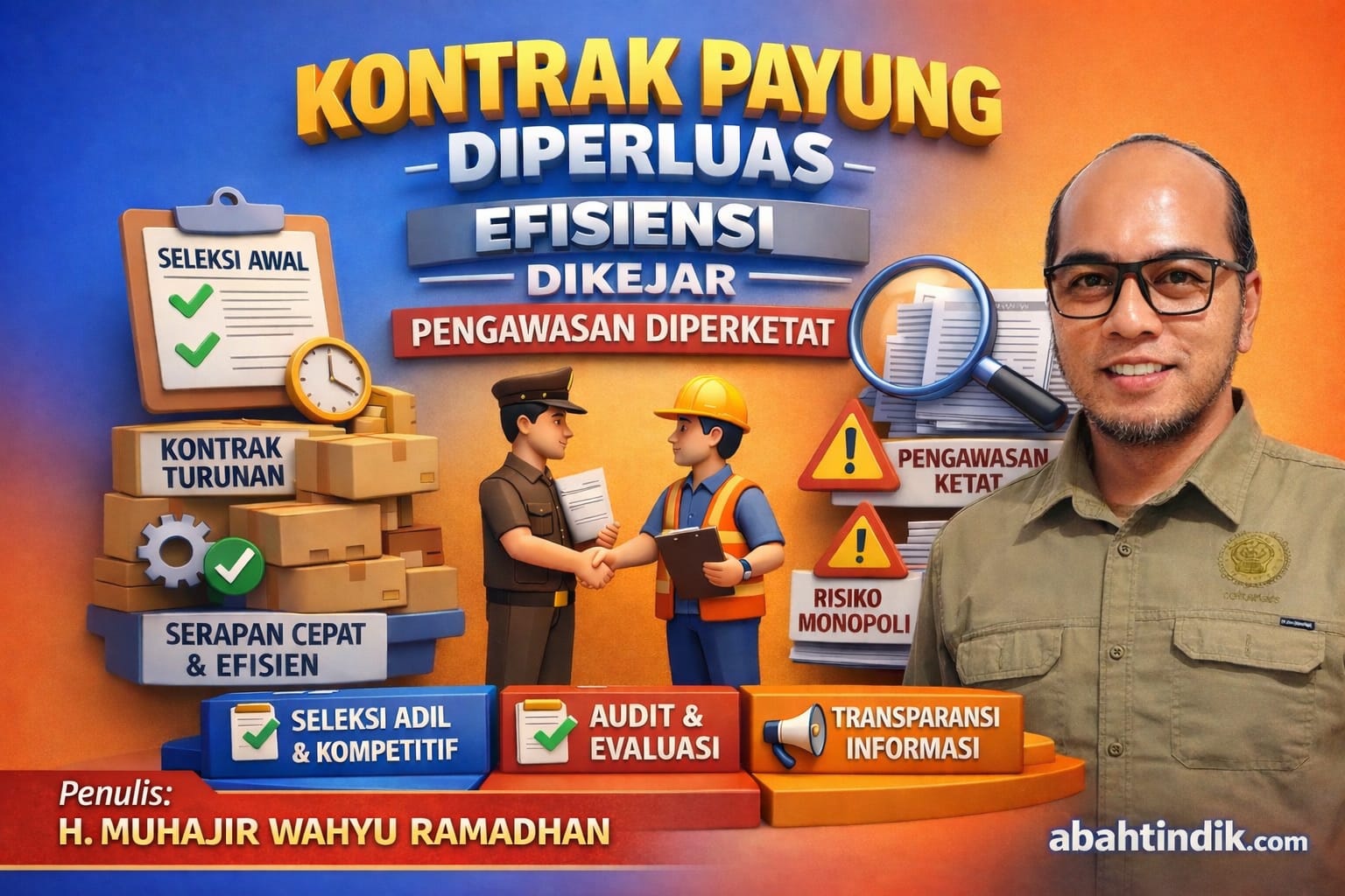 Ilustrasi opini H. Muhajir Wahyu Ramadhan tentang perluasan kontrak payung dalam pengadaan barang dan jasa pemerintah. Ia menekankan percepatan serapan anggaran harus disertai seleksi yang adil dan kompetitif, audit serta evaluasi berkala, dan transparansi informasi guna mencegah risiko konsentrasi paket dan potensi monopoli. Dok. Abahtindik.com