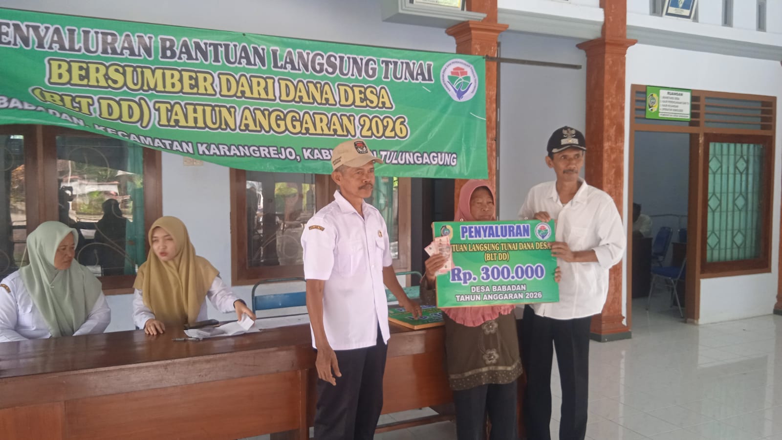 Penyaluran BLT Dana Desa 2026 di Balai Desa Babadan, Kecamatan Karangrejo, Kabupaten Tulungagung, Selasa 25 Februari 2026. Pemerintah desa menyerahkan bantuan tunai Rp900 ribu kepada warga penerima manfaat untuk alokasi Januari hingga Maret 2026.