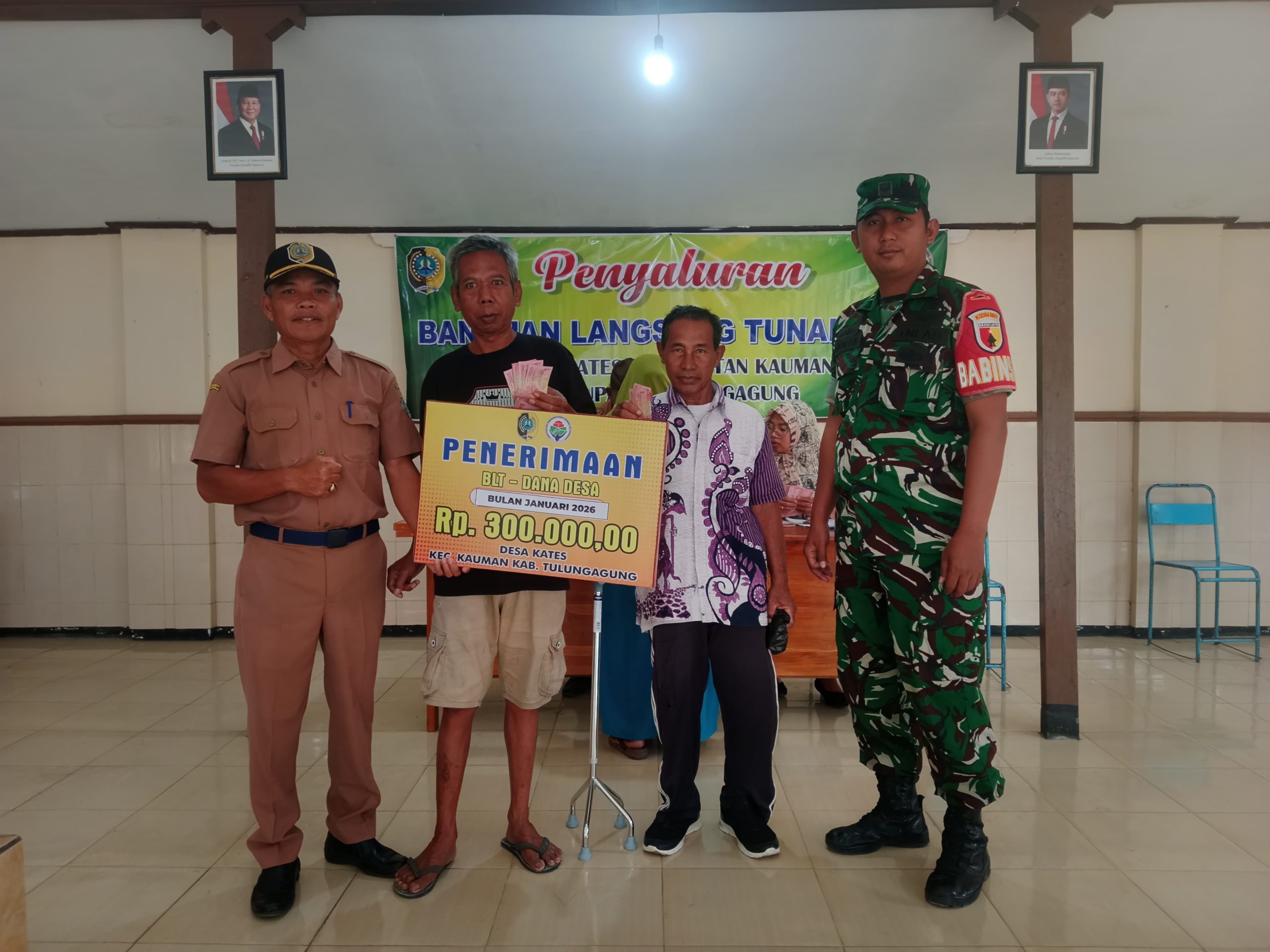 Penyaluran BLT Dana Desa 2026 di Balai Desa Kates, Kecamatan Kauman, Kabupaten Tulungagung, Selasa 24 Februari 2026.Kepala Desa Kates bersama Babinsa menyerahkan bantuan tunai Rp300 ribu kepada warga penerima manfaat untuk alokasi bulan berjalan. Program ini menyasar keluarga kategori kemiskinan ekstrem dan diawasi unsur pemerintah desa serta aparat keamanan setempat.