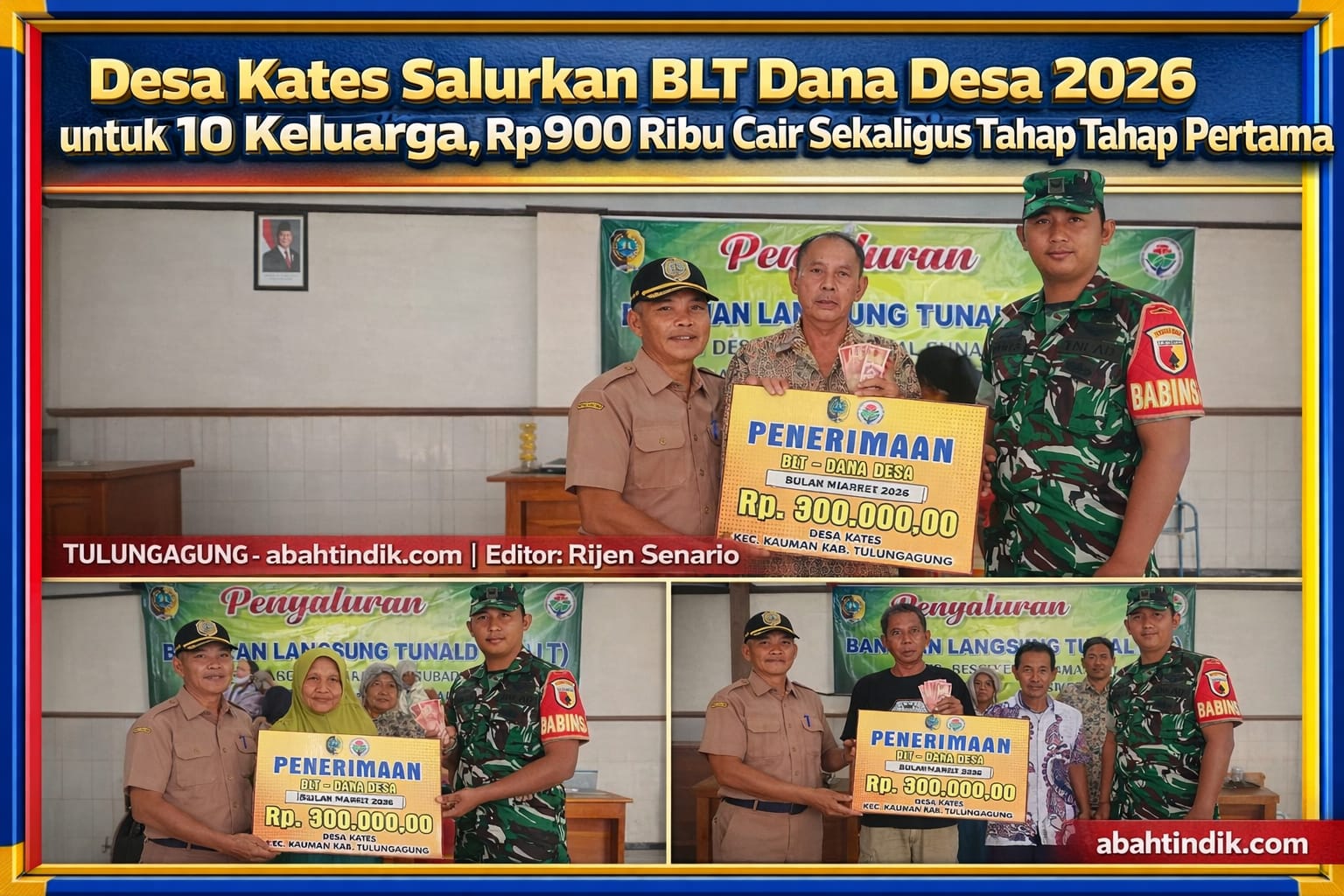TULUNGAGUNG – abahtindik.com | Pemerintah Desa Kates, Kecamatan Kauman, Kabupaten Tulungagung menyalurkan Bantuan Langsung Tunai Dana Desa Tahun Anggaran 2026 kepada 10 keluarga penerima manfaat, Selasa 24 Februari 2026. Bantuan menyasar warga kategori kemiskinan ekstrem untuk periode Januari hingga Maret 2026.