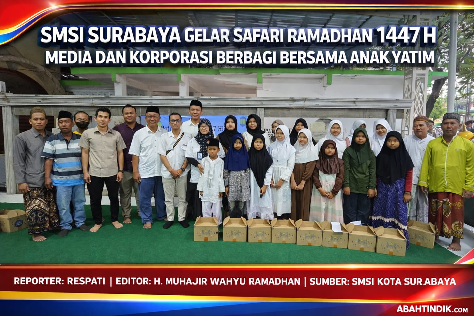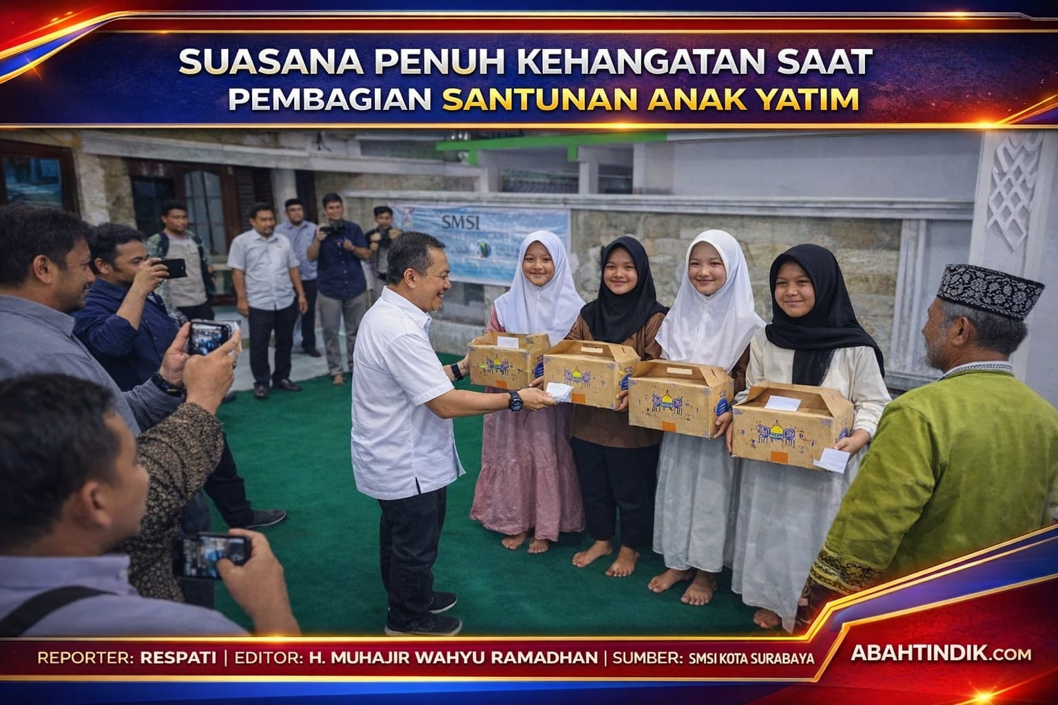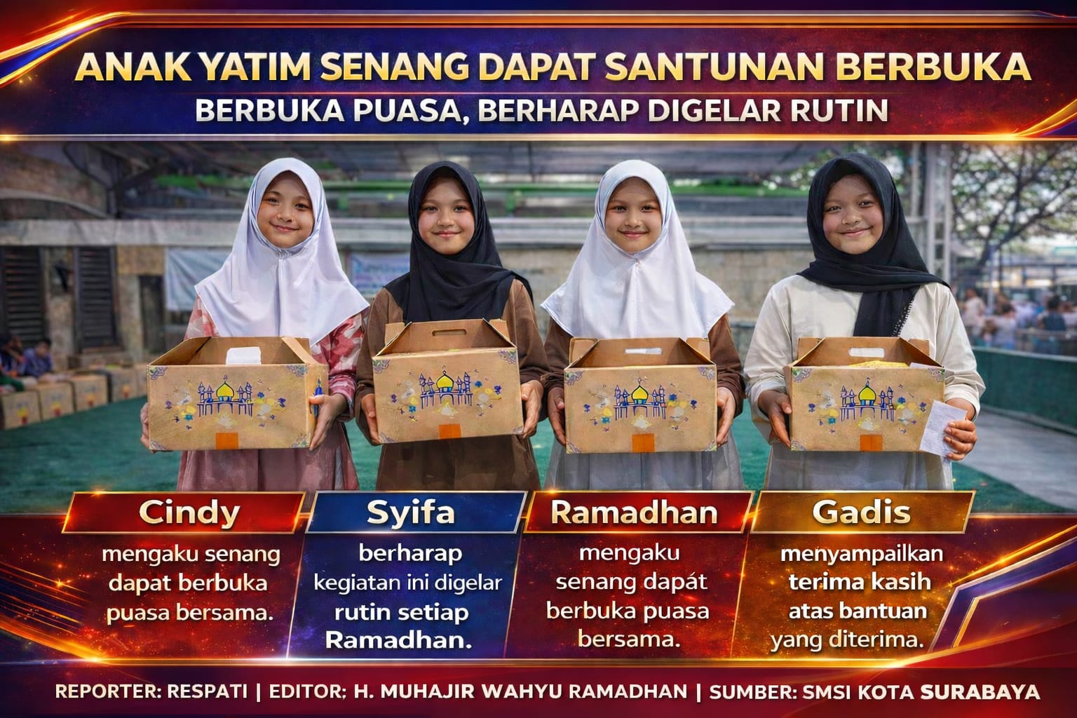 Empat anak yatim yang mewakili dari puluhan anak yatim dalam acara berbuka bersama pada Rabu, 25 februari 2026 menerima paket santunan dan berbuka puasa dalam kegiatan Safari Ramadhan 1447 Hijriah yang digelar SMSI Kota Surabaya.
