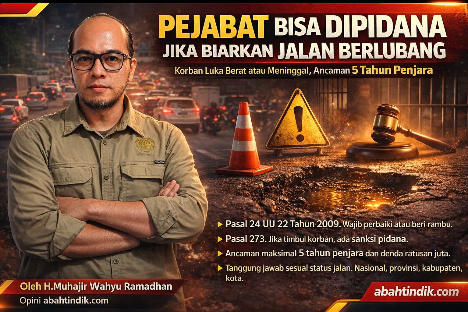Visual ini menegaskan bahwa kelalaian perbaikan dan ketiadaan rambu peringatan dapat berujung proses hukum sesuai Undang-Undang Nomor 22 Tahun 2009 tentang Lalu Lintas dan Angkutan Jalan.
