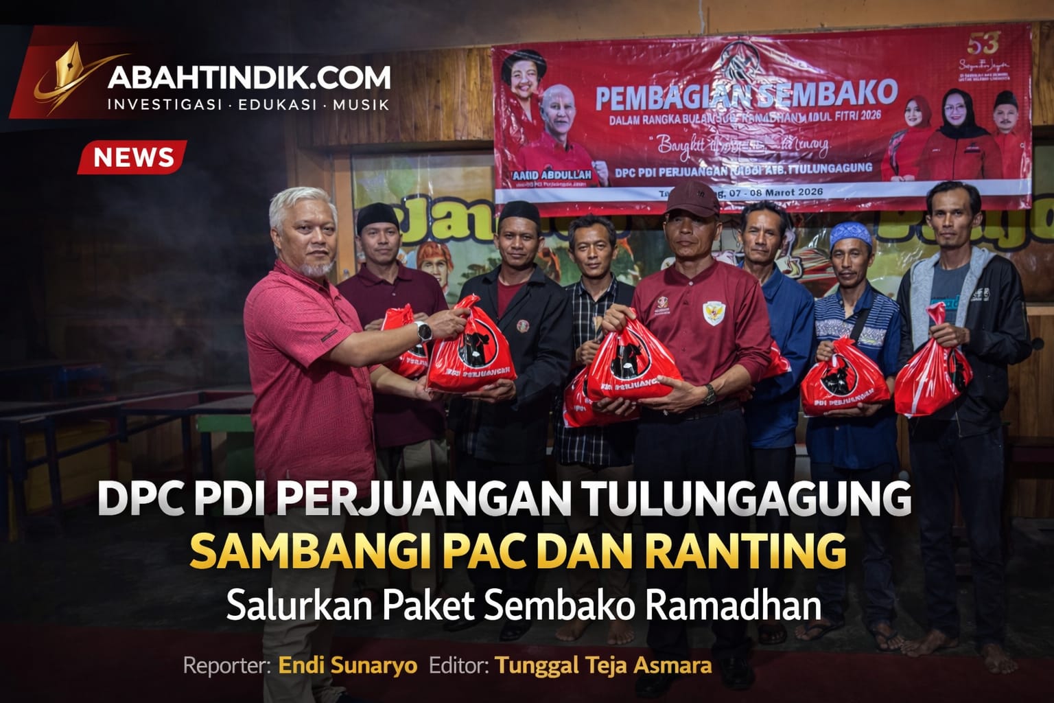 Pengurus DPC PDI Perjuangan Kabupaten Tulungagung menyerahkan paket sembako kepada pengurus PAC dan Ranting dalam kegiatan sambang struktur partai se Kabupaten Tulungagung yang dilaksanakan selama dua hari pada 7 sampai 8 Maret 2026. Kegiatan tersebut merupakan bagian dari agenda Ramadhan sekaligus penyaluran bantuan sembako dari DPD PDI Perjuangan Jawa Timur untuk memperkuat solidaritas serta kepedulian sosial antar kader partai.