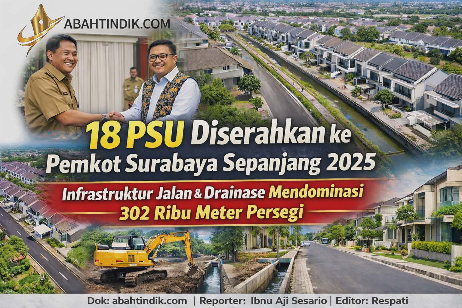 Surabaya, abahtindik.com – Pemerintah Kota (Pemkot) Surabaya menerima penyerahan sebanyak 18 prasarana, sarana, dan utilitas (PSU) dari pengembang perumahan sepanjang tahun 2025. Penyerahan ini didominasi oleh infrastruktur dasar berupa jalan dan saluran drainase dengan total luasan mencapai sekitar 302,7 ribu meter persegi.