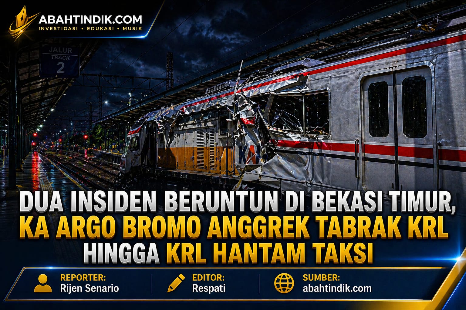 BEKASI, abahtindik.com | Kecelakaan kereta api terjadi di Stasiun Bekasi Timur pada Senin malam (27/4/2026) sekitar pukul 20.55 WIB. Insiden tersebut melibatkan Kereta Api (KA) Argo Bromo Anggrek tujuan Surabaya dengan rangkaian KRL, yang berujung pada kerusakan signifikan serta gangguan operasional jalur kereta.