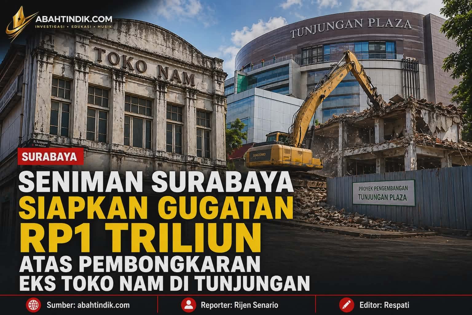 SURABAYA, abahtindik.com — Seorang seniman asal Surabaya, Kusnan, menyatakan akan menempuh jalur hukum terhadap PT Pakuwon Jati Tbk dengan nilai gugatan mencapai Rp1 triliun. Alternatif tuntutan yang disiapkan tidak hanya berupa kompensasi finansial, tetapi juga opsi pengembalian bangunan bersejarah eks Toko Nam yang telah dibongkar di kawasan Tunjungan, Surabaya.
